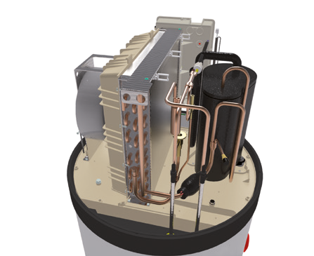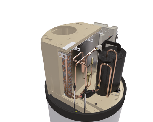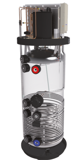 Geëmailleerde stalen tank met externe condensor en anti-legionella functie.